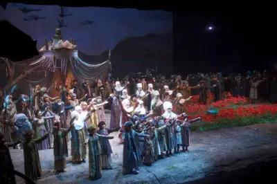 На сцене установили декорации к опере «Домалақ ана» Таскына Жармухамеда, которую публике представят 2 и 3 сентября. Шымкентский театр оперы и балета во главе с его директором - Майрой Мухамедкызы - выбрал этот спектакль для гастрольного выступления неслучайно. Эта новая в репертуаре театра опера обрела большой успех сразу после премьеры. В ней глубоко передан характерный для казахского народа образ Святой Матери. Благодаря образу юной девушки Нурилы, вдохновленной заповедями и духовными ценностями, сила материнской любви раскрывается широко и реалистично. Опера «Домалақ ана» передаёт любовь батыра Байдибека к своему народу, олицетворяет не только бескорыстное материнское сердце, но и рассказывает об одном из самых значимых событий в истории казахского народа.