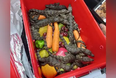 Таможенники обнаружили 54 детеныша крокодила в багаже пассажира. Он спрятал рептилий в нескольких пластиковых контейнерах среди фруктов и овощей. Контейнеры были обернуты в фольгу, чтобы затруднить сканирование багажа.