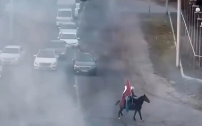 В социальных сетях появилось видео, на котором несколько автомобилей перекрыли дорогу. В центре проезжей части — мужчина на лошади с флагом в руках, рядом два автомобиля выполняют дрифт.