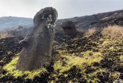 Чиновница из ведомства, занимающегося охраной памятников культуры, Каролина Перес Даттари, написала в Твиттере, что в пожаре, который вспыхнул в понедельник на этом небольшом острове в Тихом океане, выгорели около 60 гектаров растительности.