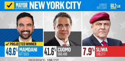 34-летний Зохран Мамдани, кандидат от Демократической партии, одержал победу над бывшим губернатором штата Нью-Йорка Эндрю Куомо, который баллотировался как независимый кандидат и кандидатом от Республиканской партии Кертисом Сливой, передает собственный корреспондент агентства Кazinform.