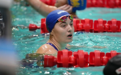 Пловчиха Софья Сподаренко выиграла решающий заплыв на дистанции 50 метров баттерфляем. На финише она показала 26.99.