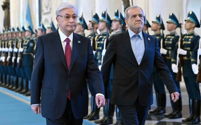 Президентский оркестр исполнил государственные гимны двух стран. Касым-Жомарт Токаев и Масуд Пезешкиан прошли по ковровой дорожке к Государственному флагу РК, после чего началась встреча глав двух государств в узком составе.