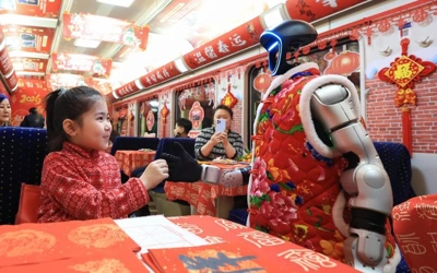 В поезде T48, следующем из Цицикара в Пекин, роботы‑гуманоиды приняли участие в традиционном «новогоднем концерте» для пассажиров, включая интерактивное общение с детьми.