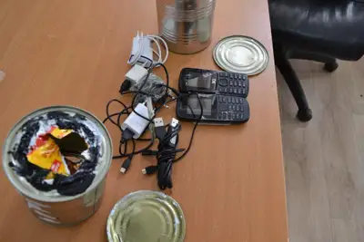 «При просмотре консервных банок на рентген-телевизионной установке, сотрудники обнаружили подозрительное содержимое банок. При вскрытии консервов были обнаружены и изъяты: два сотовых телефона, USB-кабель в количестве трех штук, bluetooth-наушники, проводные наушники, микро-флеш-карты 32-GB – 2 ед., адаптер для флеш-карты, sim-карты в количестве 6 (шести) штук (Алтел – 2 ед., Теле-2 - 2 ед., Билайн – 2 ед.); пластмассовый флакон белого цвета с прозрачной жидкостью и денежные средства в сумме 5 000 (пять тысяч) тенге», - сообщили в пресс-службе ДУИС по Карагандинской области.