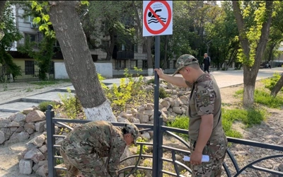 Специалисты управления по чрезвычайным ситуациям устанавливают предупреждающие таблички в запрещенных местах и наносят яркие надписи через трафареты на бетонные плиты и камни у опасных участков.