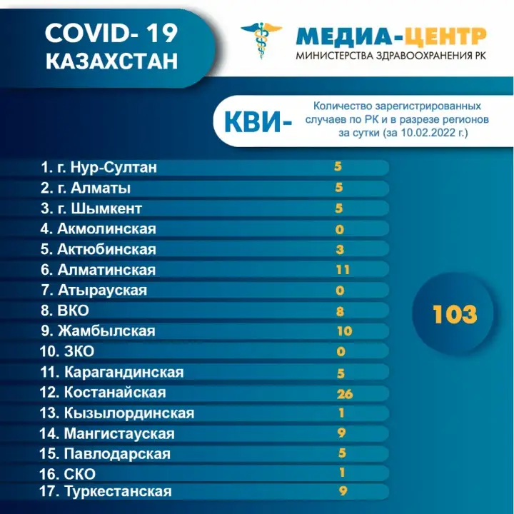 НУР-СУЛТАН. КАЗИНФОРМ - 11февраля зафиксировано 103 случаев заболевания пневмонией с признаками коронавирусной инфекции, 3 летальных исхода и 110 человек выздоровели, передает МИА «Казинформ» со ссылкой на Coronavirus2020.kz.