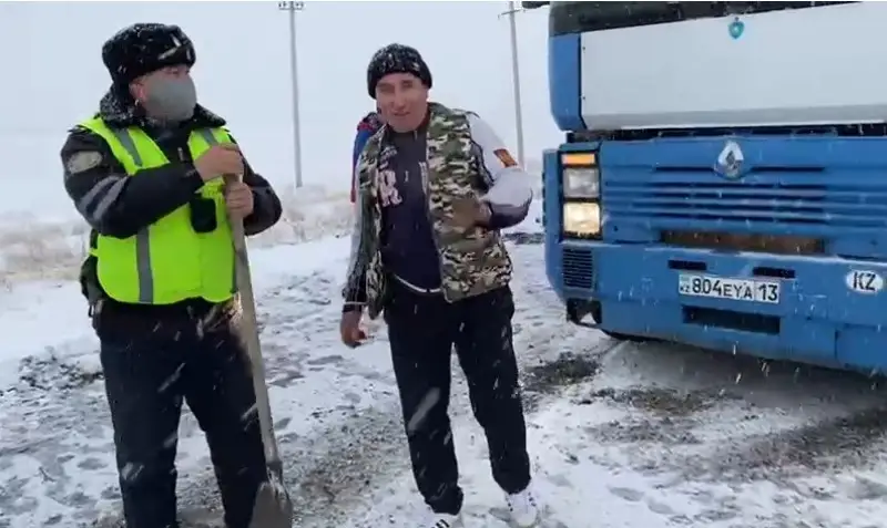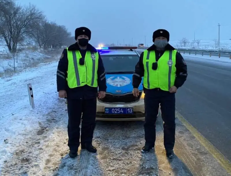Сотрудники патрульной полиции старший лейтенант Жаксылыков Галымжан и лейтенант Смандияров Алмат во время патрулирования на 647 километре трассы Алматы-Ташкент-Термез заметили на обочине грузовик, который не смог выбраться из сугробов. Непогода и обильный снегопад помешали движению автомашины, и водителю пришлось лопатой чистить снег. Увидев мужчину, который в холодный день попал в снегопад, полицейские сразу же пришли на помощь. Взяв в руки лопату, двое стражей порядка поочередно помогли очистить колеса автомашины от снега. Также они разбросали песок на проезжую часть, чтобы грузовой автотранспорт смог легко сдвинуться с места. Водитель выразил огромную благодарность полицейским за оказанную помощь. Всего с наступлением зимы за один месяц патрульные полицейские оказали помощь 12 автомобилям, застрявшим в дороге по различным причинам, и получили благодарности от водителей.