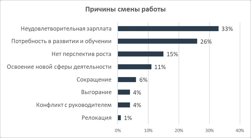 Основная причина смены работодателя – неудовлетворительный уровень зарплаты, так ответили 33% опрошенных. Хотят реализовать на новом месте свои потребности в развитии и обучении - 26%. Решают уйти на другую работу, так как не видят перспектив профессионального роста в своей компании - 15% участников опроса.