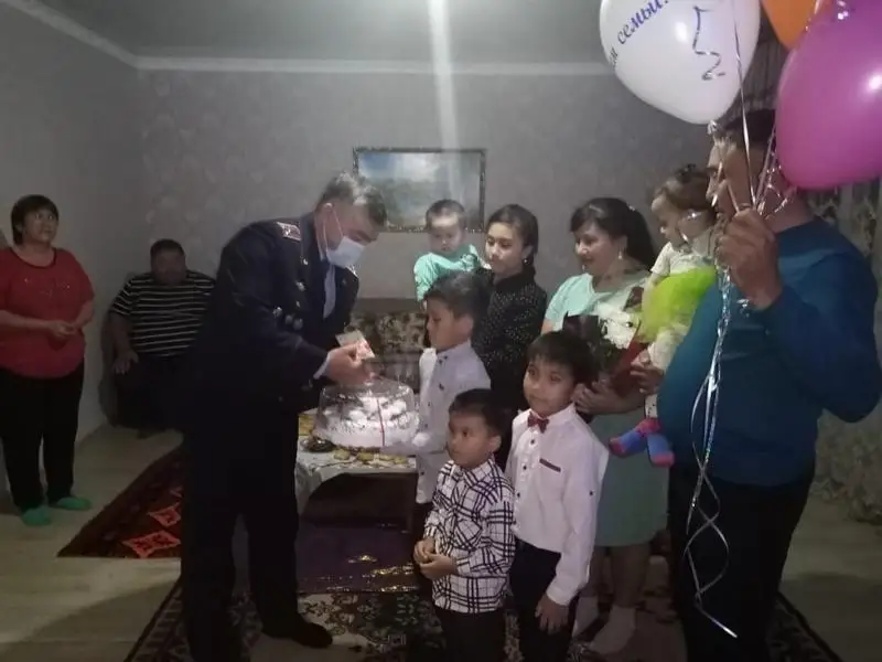 «Желаю Вашей семье счастья, благополучия, чтобы Ваши дети в будущем стали достойными гражданами нашей страны. Асылас Осербаевна, Вам, как хранительнице домашнего очага желаю терпения. Ведь быть супругой полицейского – нелегкий труд», - отметил, приветствуя семью Букановых, полковник полиции Аслан Кызбикенов. Он вручил грамоту и денежное поощрение супруге полицейского, а детям – шары и торт.