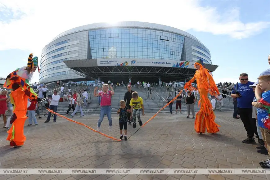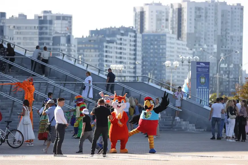 Еще до начала праздничной церемонии на площадках у «Минск-Арены» стали собираться жители и гости столицы. Их развлекали ростовые куклы, с которыми охотно фотографировались не только дети, но и взрослые. Погода в это воскресенье не подвела, поэтому на площадке было довольно людно.