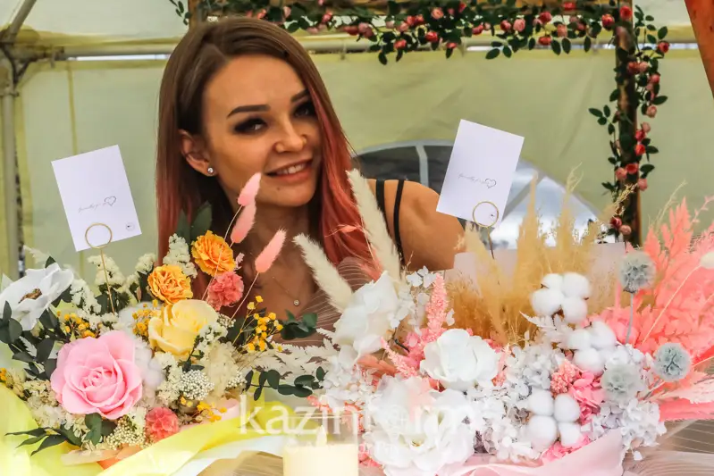 «Мы занимаемся стабилизированными цветами, они долговечные - стоят от 3 до 5 лет. За ними не сложно ухаживать. Специальных требований нет. Главное держать цветы подальше от солнечных лучей и избегать попадания влаги. Чтобы очистить их от пыли, надо использовать мягкую губку или фен, настроив его на слабый холодный поток воздуха. Здесь у нас каждая роза, каждый бутон раскрывается. Они доставляются к нам из России. Каждый лепесточек переклеивается, это особая флористика, ручная работа. Поэтому цены дорогие - от 10 тысяч тенге и выше», - говорит цветочница по имени Надежда.