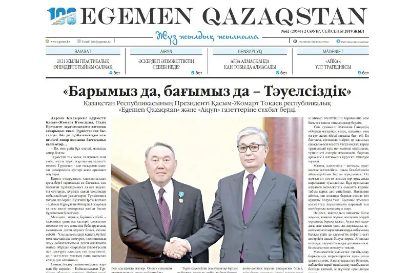 Первое интервью Главы государства Касым-Жомарта Токаева было опубликовано в газетах «Egemen Qazaqstan» и «Aiqyn». Это интервью можно считать ответом на многие вопросы, беспокоящие общество в момент смены власти. В ходе обстоятельной беседы Президент говорил о борьбе с коррупцией, о достойном образовании для молодежи, меритократии, уменьшении зависимости от нефтяных доходов, повышении благосостояния народа, поддержке многодетных семей, обеспечении жильем, привлечении инвестиций, о языке, переходе на латиницу и других вопросах. Самое главное, Касым-Жомарт Токаев в этой беседе заявил о своих трех принципах в качестве Президента.
