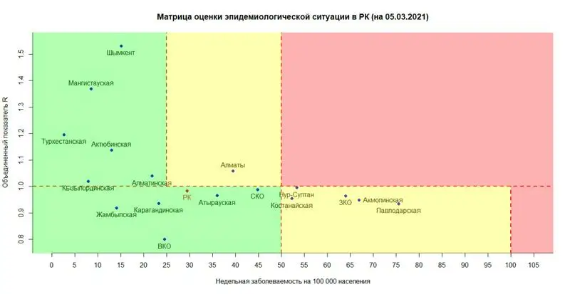 НУР-СУЛТАН. КАЗИНФОРМ - Опубликована матрица оценки эпидемиологической ситуации в регионах Казахстана на 5 марта текущего года, передает МИА «Казинформ» со ссылкой на Telegram-канал Межведомственной комиссии по нераспространению COVID-19.