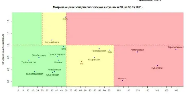 Согласно матрице оценки эпидемиологической ситуации в регионах Казахстана на 30 мая 2021 года, в «красной» зоне находятся: гг. Нур-Султан, Алматы и Акмолинская, Карагандинская области.
