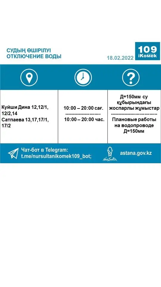 «С 10:00 до 20:00 будет отключена подача воды столичным абонентам по следующим адресам: улица Куйши Дина 12, 12/1, 12/2, 14; улица Сатпаева 13, 17, 17/1, 17/2», - сообщил Городской центр мониторинга и оперативного реагирования в Telegram.
