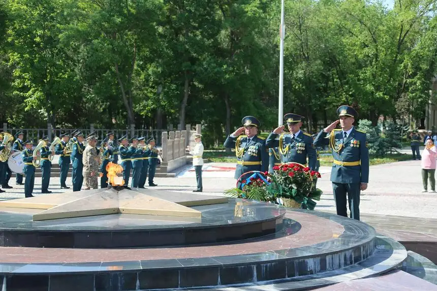 Церемония возложения венков военнослужащими РгК «Юг» в честь Дня защитника Отечества состоялась в таразском парке Победы у Вечного огня, расположенного у подножия памятника Бауыржану Момышулы.
