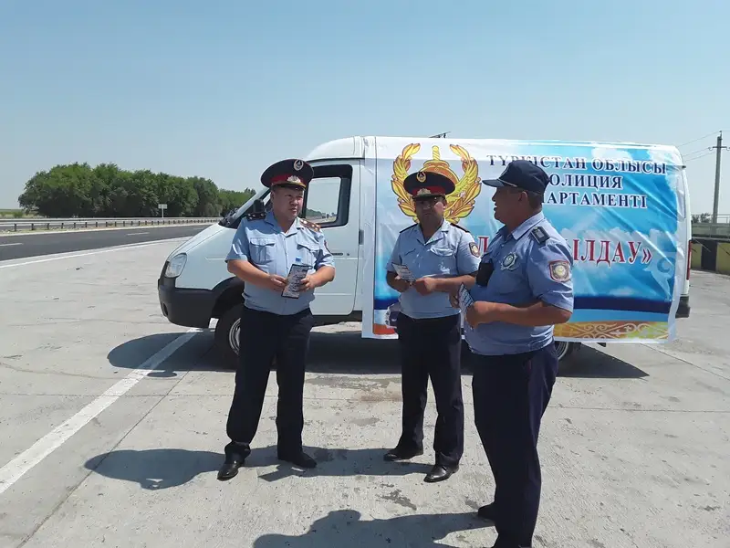 ТУРКЕСТАН. КАЗИНФОРМ - Полицейские Туркестанской области в рамках оперативно-профилактического мероприятия «Безопасная дорога» провели акцию «Приемная на дороге» на трассе республиканского значения Туркестан - Шымкент. Сотрудники управления административной полиции ДП Туркестанской области совместно с автоэкипажами батальона патрульной полиции местной полицейской службы раздали водителям автотранспорта брошюры о правилах дорожной безопасности и бутылки с водой, передает МИА «Казинформ» со ссылкой на пресс-службу ДП области.