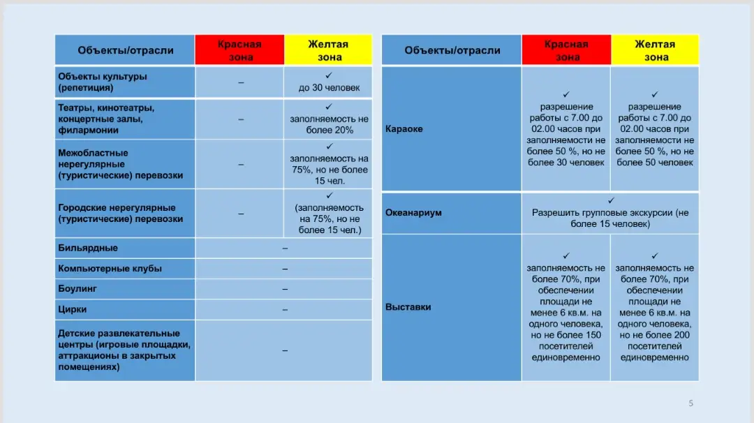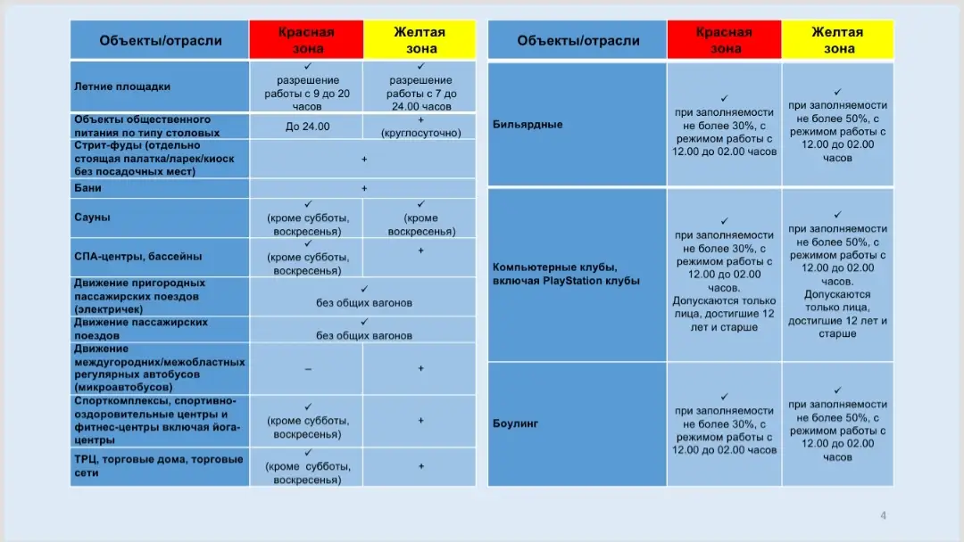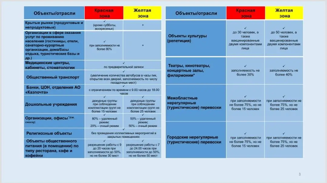 Согласно постановлению главного государственного санитарного врача РК, критерии ограничения разделены на два блока: для объектов, не являющихся участником проекта «Ashyq» и участвующих в проекте «Ashyq».